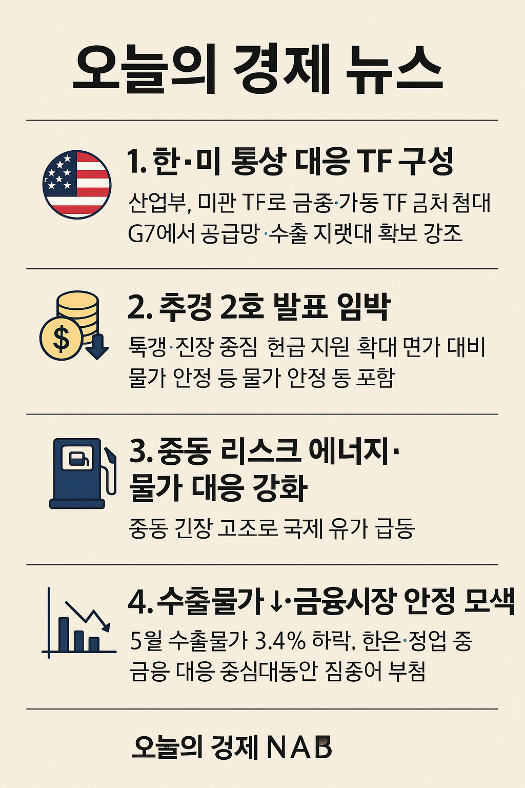 - 산업통상자원부는 미국의 자동차·철강·반도체 관세 우려에 대비해 민관 합동 TF를 6월 16일 출범시켰습니다.